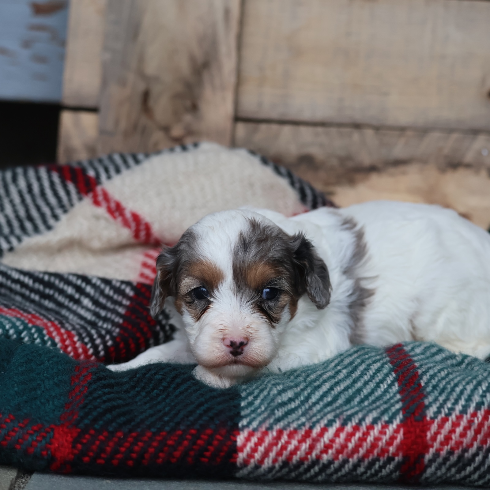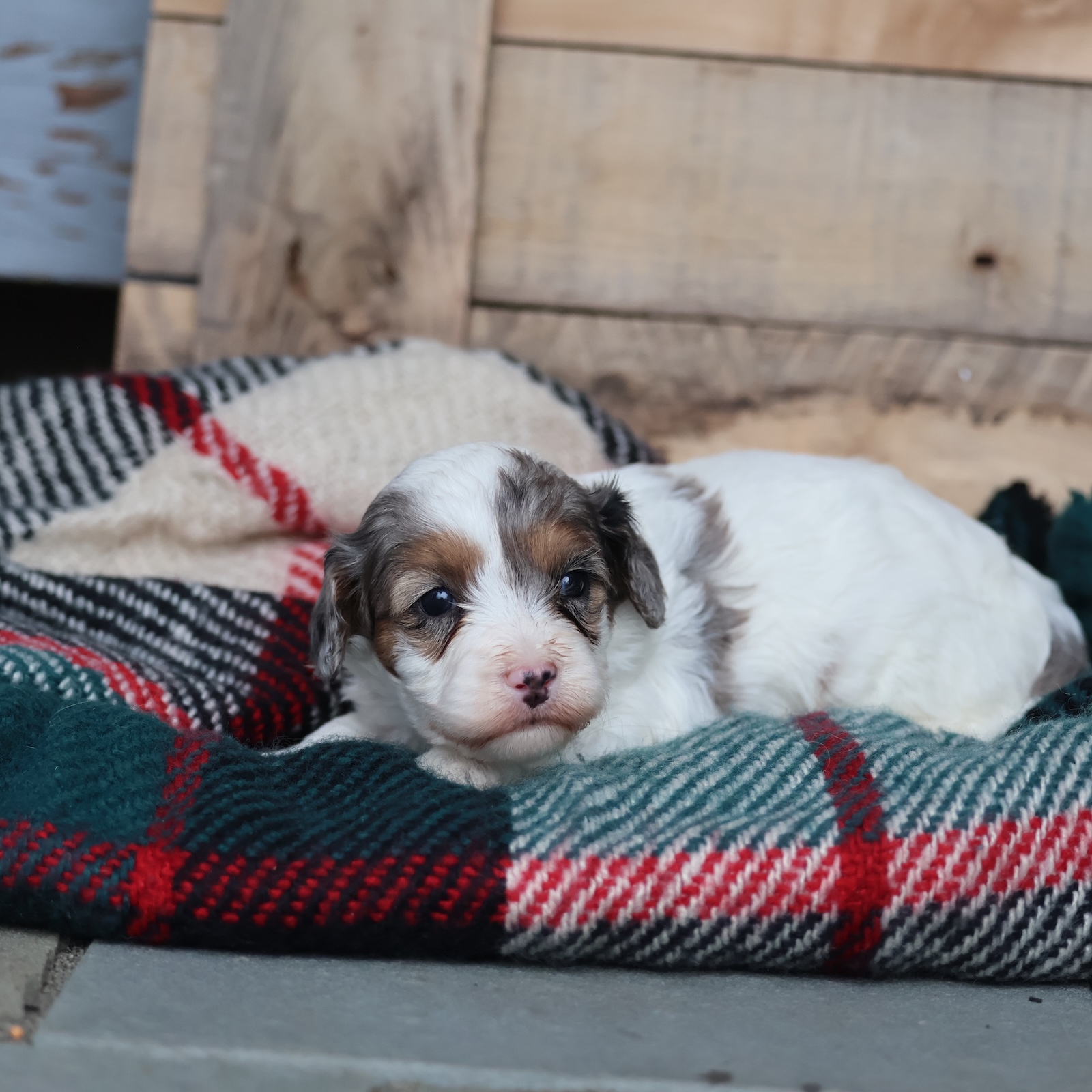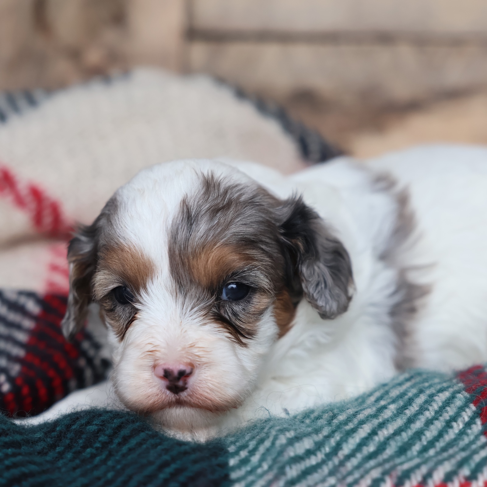 Meet Frosty—your tiny snowday best friend. This handsome little Cavapoo has a bright, happy sparkle that lights up a room faster than a tree topped with twinkle lights. Frosty is curious, fun, and full of sweet puppy wonder, like he’s discovering the world one jingle at a time. He’s the type to prance right into your heart, then stay there, warming your winter with snuggles and silliness. Whether he’s romping around like a little holiday elf or napping peacefully in your lap, Frosty turns ordinary moments into something merry.